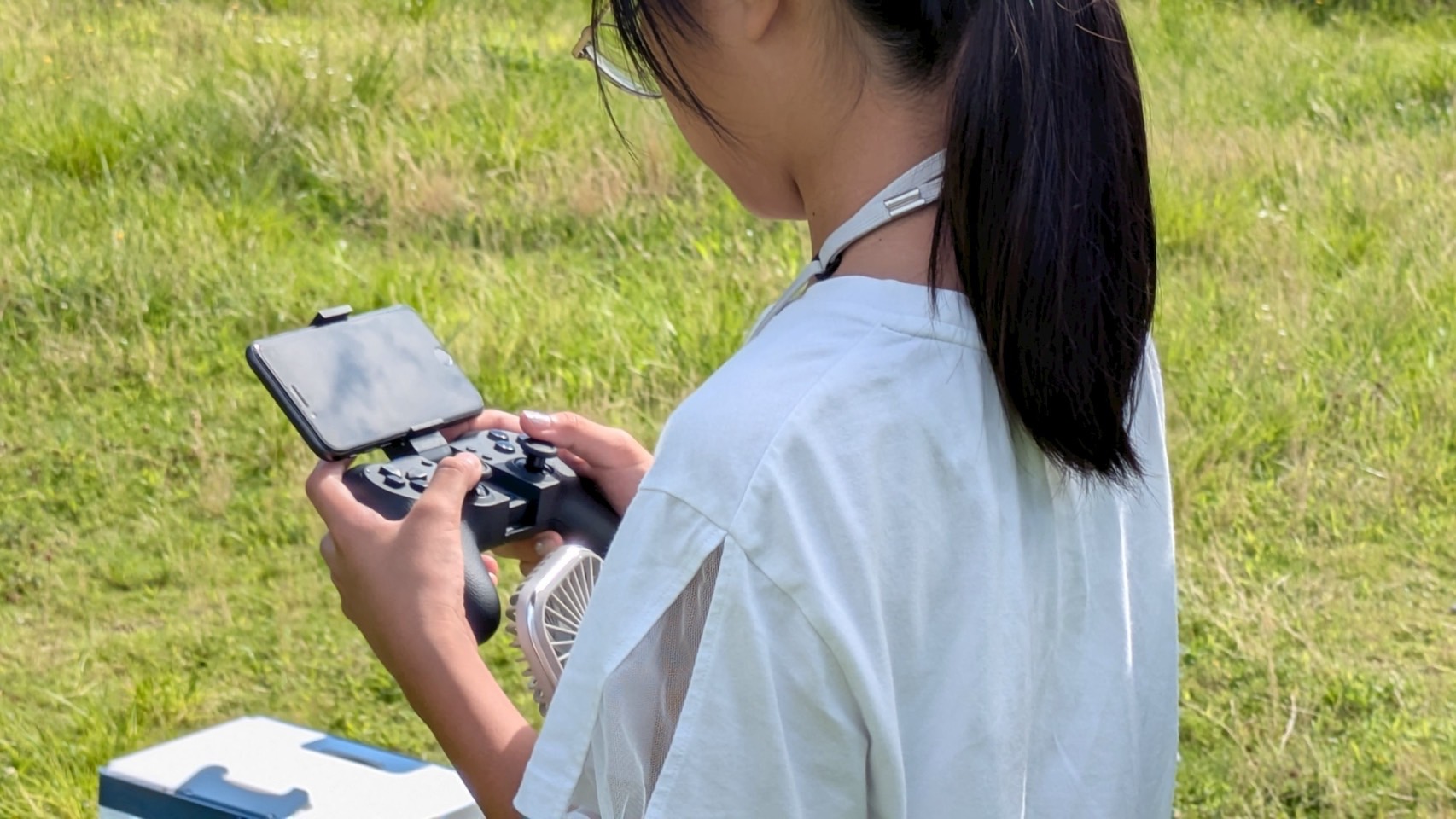 この日は比較的温度が上がらない早朝に実施した上で、フライトごとのインターバル時間を長めにとったり、クーラーボックスに沢山の保冷剤を詰めるなどして、バッテリーやドローン本体のオーバーヒート対策を行い、無事に操縦体験と空撮を遂行しました。